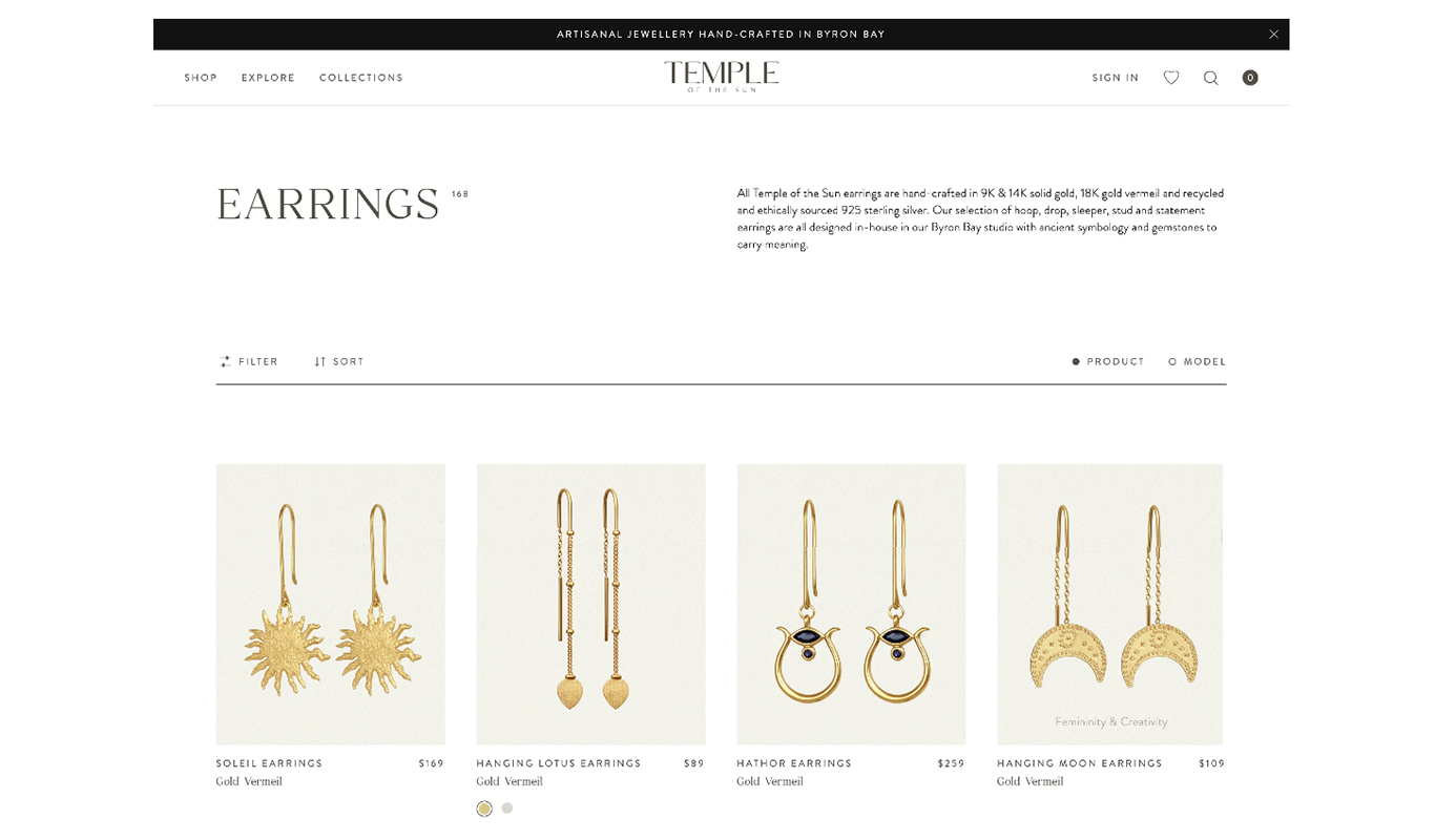 Temple of the Sun also uses close up imagery of their products but they do so in a more vertically symmetrical layout for a more clean look. They also include a brief description about their collection to exude a specific mood.